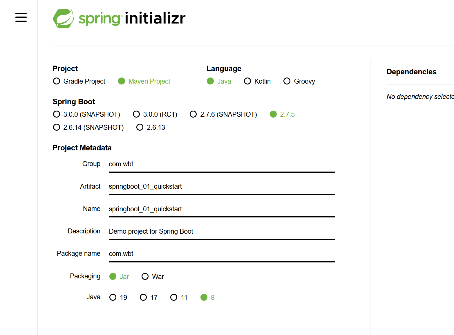 在入门案例中之所以能快速构建 SpringBoot 工程,是因为 Idea 使用了官网提供了快速构建 SpringBoot 工程的组件实现的。那如何在官网进行工程构建呢?通过如下步骤构建