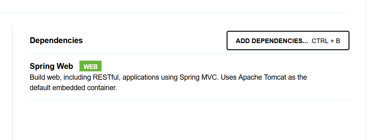 选择 Spring Web 可以点击上图右上角的 ADD DEPENDENCIES... CTRL + B 按钮,就会出现如下界面